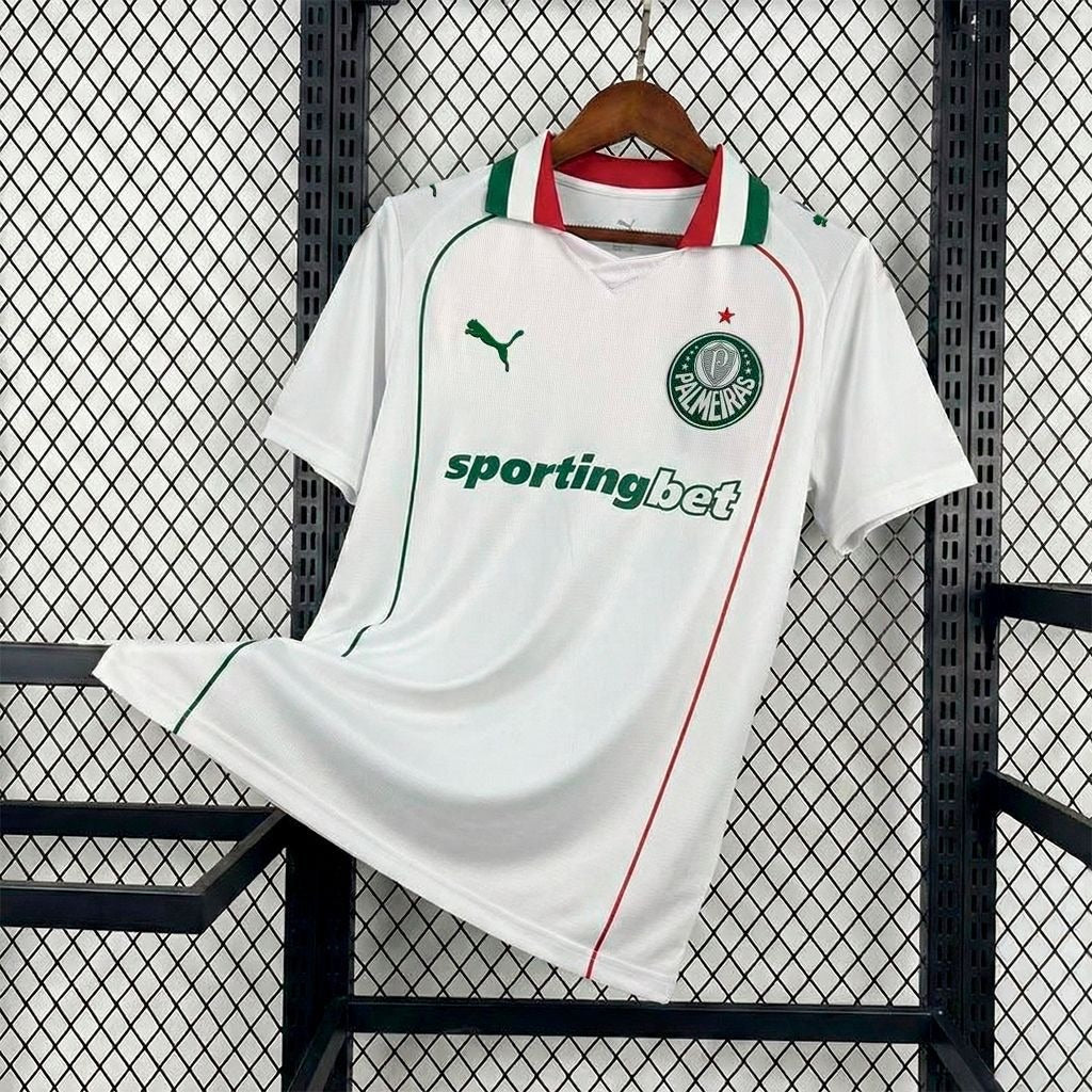 A camisa branca do Palmeiras 2026/27 traz um design elegante com detalhes nas cores verde e vermelho inspirados na origem italiana do clube. É perfeita para torcer, jogar bola ou usar no dia a dia representando o Palmeiras com orgulho.